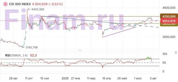 CSI 300. Индекс CSI 300 встретил сопротивление на подходе к уровню 4200 пунктов, о чем говорит разворот RSI в зоне перекупленности. Индекс возвращается к линии среднесрочного восходящего тренда в район 4000 пунктов, вблизи которого имеется уровень поддержки. Следующий серьезный уровень поддержки находится вблизи значения 3830 пунктов.