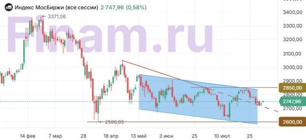 Техническая картинаИндекс МосБиржи . Индекс МосБиржи все еще остается в состоянии консолидации, границы которой теперь находятся на 2600 и 2860 пунктов. До выхода за эти пределы преждевременно судить о направлении будущего тренда.