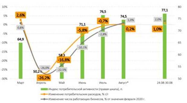 Индекс потребительской активности, рассчитанный на портале Сбербанка SberIndex.ru, достиг на прошедшей неделе 77,1 пункта из 100. После кризиса он еще не поднимался на такую высоту. Однако, уточняют аналитики СберИндекса, это связано не с объемом расходов, а с их разнообразием: накануне учебного года россияне покупали самые разнообразные товары, и индекс это учитывал. Количество работающих торговых точек растет - с 24 по 30 августа их было на 2% больше, чем в среднем за неделю в феврале 2020 года.