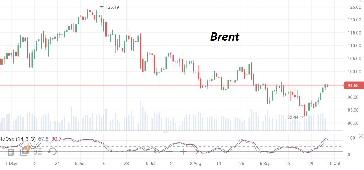 Нефть Brent. Как и ожидалось, котировки нефти марки Brent в конце этой недели поднялись до ближайшей цели роста в районе $95/барр. Этому способствовало решение ОПЕК значительно сократить объемы своей добычи. Возле текущих отметок котировки нефти могут войти в консолидацию, чтобы снять накопившуюся локальную перекупленность, и потом рост цен может быть продолжен. Стохастик пока смотрит вверх, что указывает на возможный рост цен в краткосрочной перспективе.