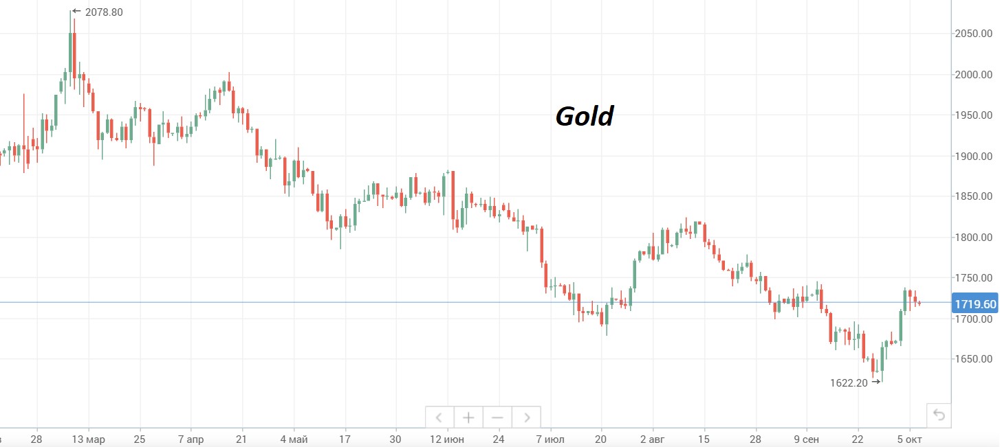 Золото. За две предыдущие сессии индекс доллара стал вновь показывать силу, при этом вновь пошли в рост доходности по USTres. Эти факторы привели к остановке подъема цен на золото и к их коррекции - в пятницу утром драгметалл торгуется на $1719/унц. Как видим на дневном графике, котировки драгметалла немного недошли до ближайшей цели роста в районе $1750/унц. Возможно вскоре мы увидим возврат цен на золото к ранее взятому уровню $1680/унц. Если покупатели его удержат, то дальнейший подъем цен может быть продолжен.