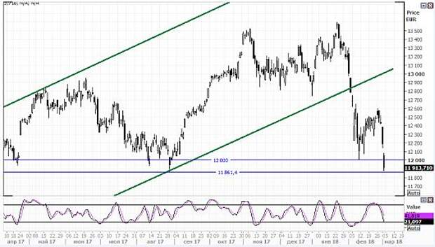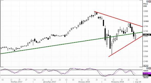 08%; рынок акций Германии упал на 4,56%. Минувшая неделя оказалась неудачной для покупателей по нескольким причинам. Первым разочарованием для инвесторов стали выступления нового главы ФРС Джерома Пауэлла перед Палатой представителей и Сенатом. Напомним, что он намекнул на то, что в текущем году может быть более трех повышений процентных ставок, так как прогноз для экономики США остается сильным, а волатильность рынков не нанесет ей существенного урона. Также Джером Пауэлл считает, что сильный рынок труда подстегнет потребительские расходы, тогда как компании будут чувствовать себя увереннее, что повысит производительность труда. Вторым ударом для мировых рынков стало заявление президента США Дональда Трампа о том, что необходимо повысить тарифы на импорт стали и алюминия на 25% и 10% соответственно, тем самым спровоцировав очередной виток торговой войны. Стоит отметить, что Дональд Трамп должен подписать приказ о пошлинах уже на текущей неделе. Из важной макроэкономической статистики в США был опубликован пересмотренный ВВП, который в четвертом квартале увеличился на 2,5%, тогда как предыдущая оценка была +2,6%. Также разочаровали данные по заказам на товары длительного пользования, которые в январе резко упали на 3,7% по сравнению с ростом на 2,6% в декабре. В Китае был обнародован индекс деловой активности в промышленности Caixin, который в феврале составил 51,6 пункта против прогноза 51,3 пункта, однако февральский индекс деловой активности в промышленности NBS оказался хуже ожидания и составил 50,3 пункта. На текущей неделе участникам рынка стоит обратить внимание на пятничный блок данных по рынку труда в США. Согласно нашим ожиданиям, занятость в несельскохозяйственном секторе в феврале увеличилась на 200 тыс., а уровень безработицы составил 4%. Также будут опубликованы средняя почасовая заработная плата и средняя продолжительность рабочей недели. Мы считаем, что даже если данные окажутся чуть хуже ожиданий, то ФРС все равно повысит процентную ставку на мартовском заседании. На текущий момент вероятность денежно-кредитного ужесточения в марте оценивается в 83%. Помимо этого, состоятся выступления представителей ФРС, а именно Уильяма Дадли, Эрика Розенгрена и Чарльза Эванса. В четверг в еврозоне и Японии состоятся заседания ЕЦБ и Банка Японии. Мы ожидаем, что оба регулятора сохранят процентные ставки на прежних уровнях 0% и 0,1% соответственно. Тем не менее, участникам рынка стоит проследить за дальнейшей пресс-конференцией главы ЕЦБ Марио Драги. В Китае выйдут данные по сальдо торгового баланса. Аналитики ожидают, что в феврале дефицит составил $5,3 млрд. Также стоит отметить, что в минувшее воскресенье в Италии состоялись парламентские выборы, но, как и ожидалось ни одной из коалиций не удалось набрать необходимые 40% голосов для формирования большинства в парламенте. Отметим, что после обработки более 50% бюллетеней (на 09:00 по МСК) правоцентристская коалиция, лидером которой является Сильвио Берлускони набирает 37% голосов, тогда как "Движение 5 звезд" получает порядка трети голосов. Сезон корпоративных отчетностей почти практически завершен. На текущий момент отчитались уже 97% компаний, входящих в состав индекса Standard & Poor's 500, из них 77% фирм сообщили о выручке и прибыли превысившей ожидания аналитиков. С технической точки зрения на дневном 