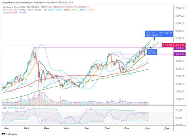 Что касается краткосрочных прогнозов, то ETH находится в канале роста после небольшой коррекции к $4380, и уже к концу недели цена может приблизиться к $5000. Немного слабее смотрится тренд BTC - в течение недели ждем тестирование предыдущих максимумов $66 600 или "боковую" динамику.