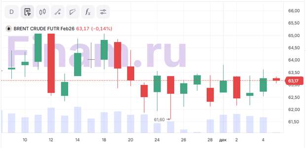Нефть дешевеет на фоне снижения цен Саудовской Аравией для азиатских покупателей до 5-летнего минимума: фьючерс Brent опустился на 0,14%, до $63,17 за баррель, цена WTI – на 0,23%, до $59,52.