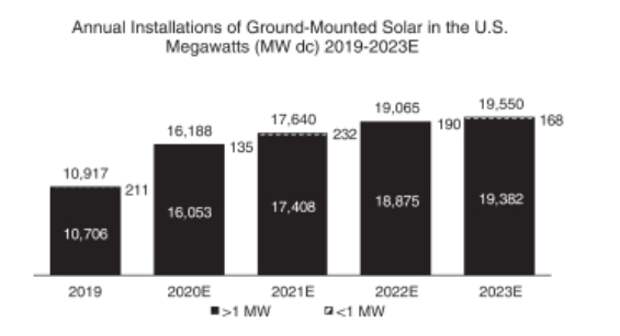 Согласно прогнозам IHS Markit, темпы роста будут оставаться высокими, и установленная мощность наземных систем в США увеличится с 10.9 ГВт в 2019 до 19.6 ГВт к 2023, а среднегодовой темп роста может составить 16%.