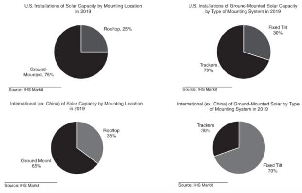 Система, которая держит солнечные панели и прочее оборудование, называется системой установки, которые делятся на трекеры, которые могут двигаться в течение дня и генерируют больше энергии, чем другие - фиксированные системы. В 2019 году около 70% и 30% наземных "солнечных" в США и за рубежом (искл. Китай), соответственно, использовали трекеры.